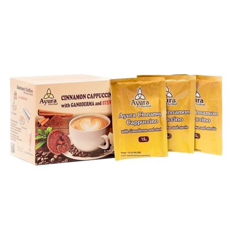 Cappuccino cu Ganoderma, Scortisoara si Stevie Ayura este alegerea ideală pentru iubitorii de cafea care caută o variantă mai sănătoasă și echilibrată. Această cafea inovatoare combină aroma bogată a cafelei instant cu beneficiile scorțișoarei și ganodermei, fiind îndulcită natural cu stevia – un îndulcitor fără calorii, perfect pentru menținerea glicemiei în limite normale.