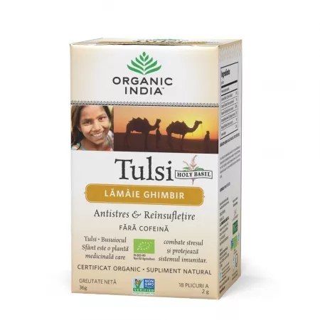 Ceai Tulsi (Busuioc Sfant) cu Lamaie si Ghimbir, Antistres Natural & Reinsufletire este un produs 100% Certificat Organic si nu contine organisme modificate genetic. Nu contine si nu sunt folosite in niciun stagiu al productiei pesticide sintentice, erbicide, ingrasaminte sau alte tratamente chimice.